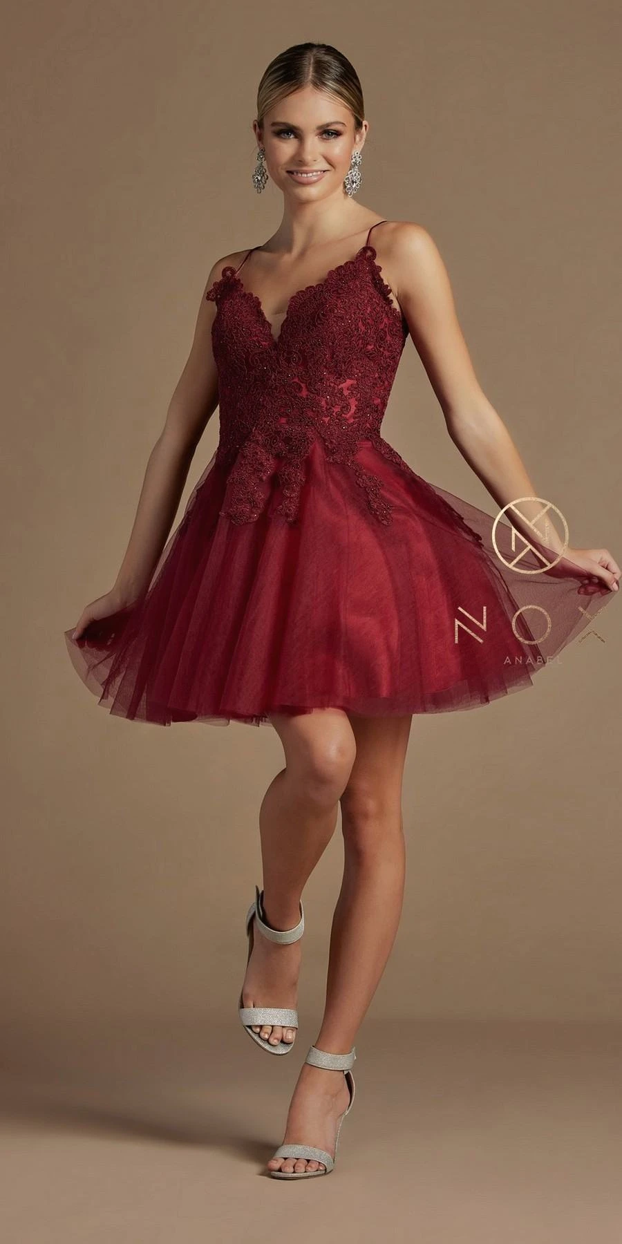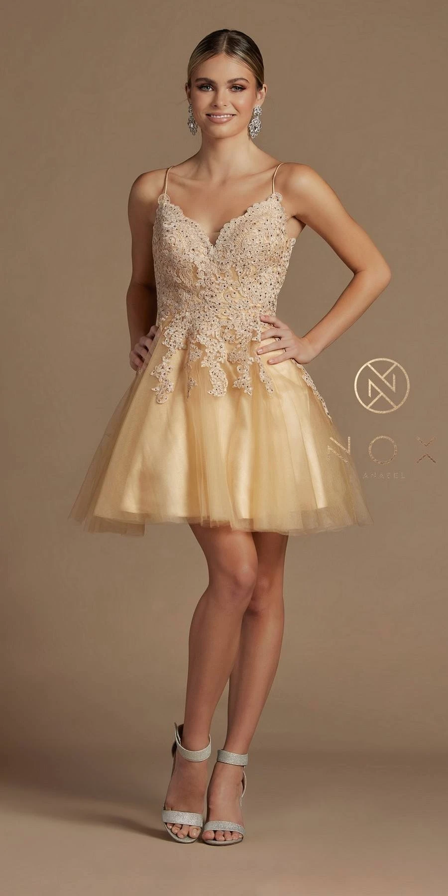 Imagine yourself in this beautiful short A-line gown for your next formal event. This short tulle dress by Nox Anabel R707 is sleeveless with spaghetti straps and features a lace applique bodice, tulle overlay and satin underline and a criss cross strapped corset back. An ideal short dress for homecoming, pageant, prom or in any other formal occasions!Â