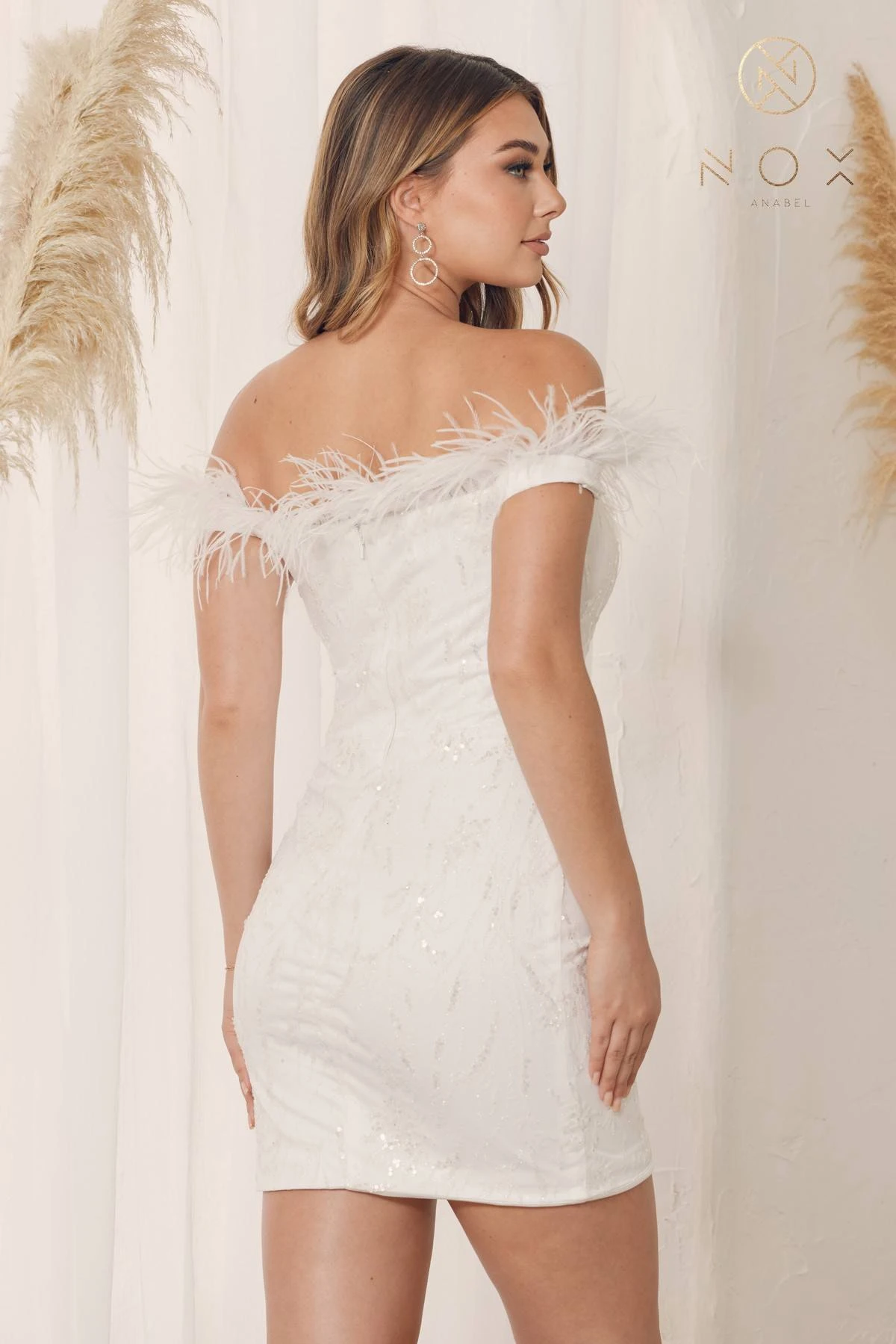 This short feather straps sequin dress by Nox Anabel T790 is a must-have! It features a fitted silhouette, off the shoulder straps and straight neckline, and a side leg slit that adds a touch of drama. Sequins create a twinkle and shine, while the back zipper keeps it secure. Perfect for evening events! An ideal short dress for homecoming, damas, prom or in any other formal occasions!Â