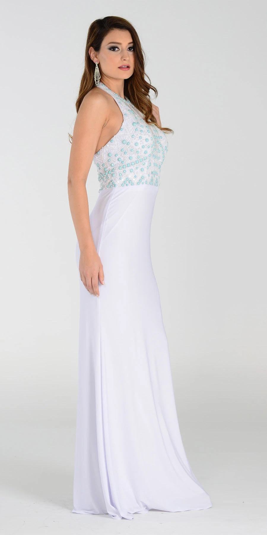 LIMITED STOCK – Dress up for your next special occasion in this beautiful floor length sheath column prom dress. This full length ITY stretch jersey gown is sleeveless with halter strap and high neckline and features sequins, beads and stones across the bodice. An embellished back enhance the beauty of this dress.