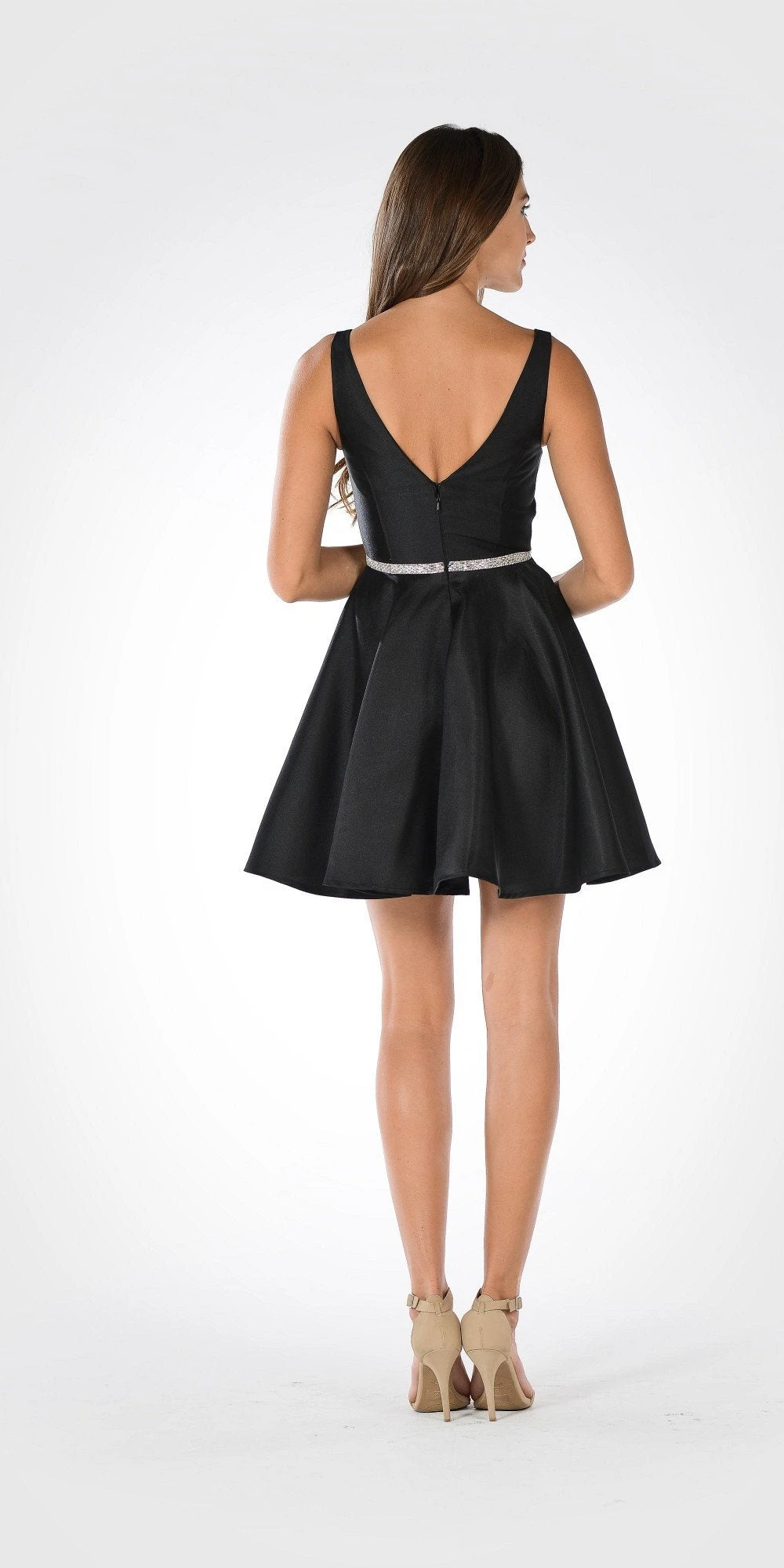 This A-line dress by Poly USA | Ed Young 7894 features a sheer inset on the plunging neckline and V-shape back is a lovely outfit for homecoming event. This dress even comes with pockets to fit the small things you know you always need to have on hand.