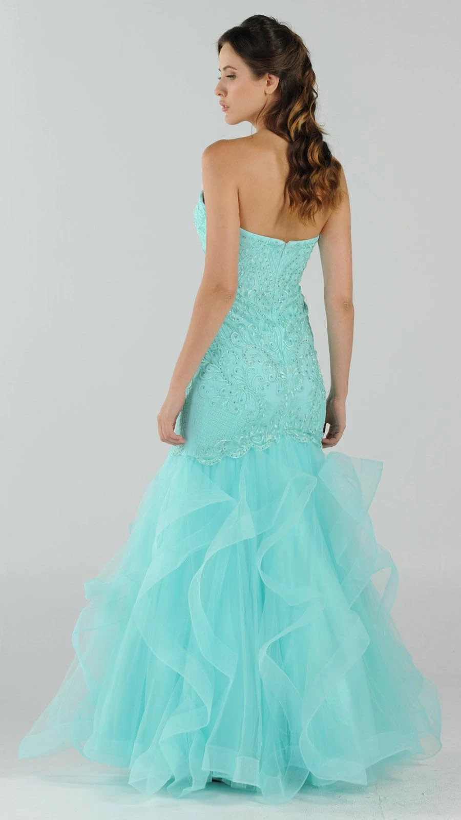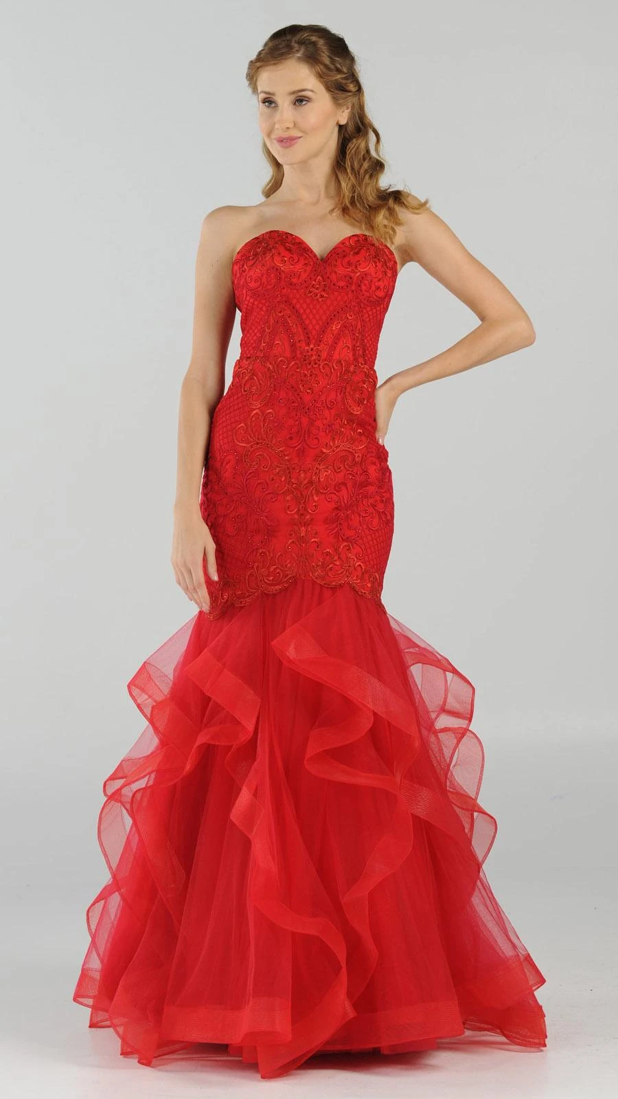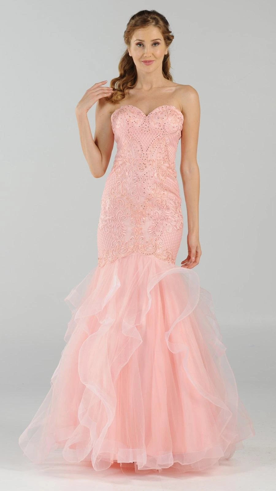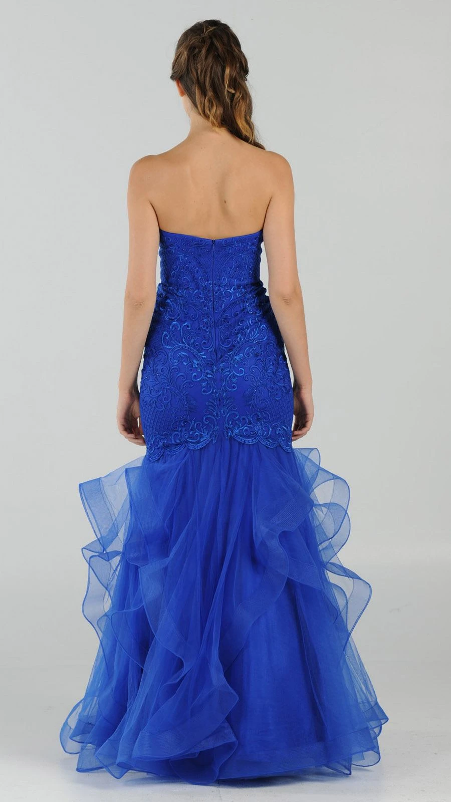 This strapless long prom dress has sweetheart neckline and a fitted bodice with astonishing embroidery and beading. An exceptional outfit for prom, awards night or graduation ball. Create a memorable and fabulous celebrations wearing this mermaid style tiered evening gown by Poly USA | Ed Young 8198.
