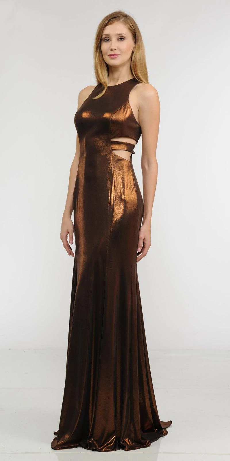 Stunning metallic foil floor length evening gown by Poly USA | Ed Young 8270 in gold. This sleeveless gown is stretchy with round neckline, cut-in shoulder, racer back style and side cut-outs. Be confidently beautiful wearing this gown for prom, awards night, gala or any other social gatherings.Â