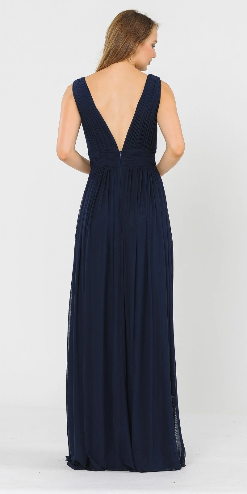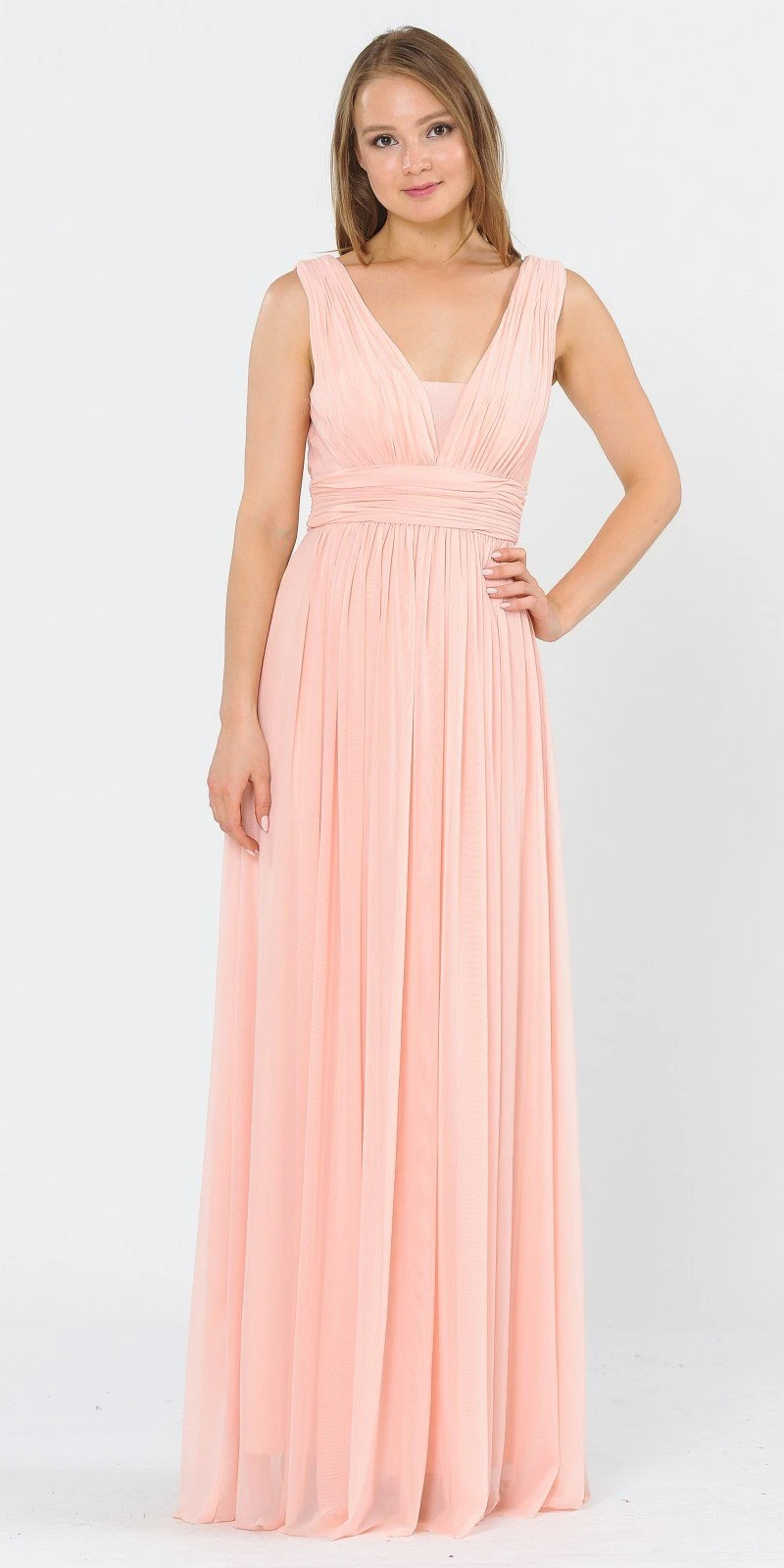 This gorgeous a-line silhouette long formal dress in blush is ideal for wedding guests, bridesmaids and in any other formal occasions! This made of soft chiffon fabric dress features a ruched bodice with deep v-neck and back, accented with wide band that emphasize the natural waist. This sleeveless gown by Poly USA | Ed Young 8408 in blush is also available for plus sizes!Â
