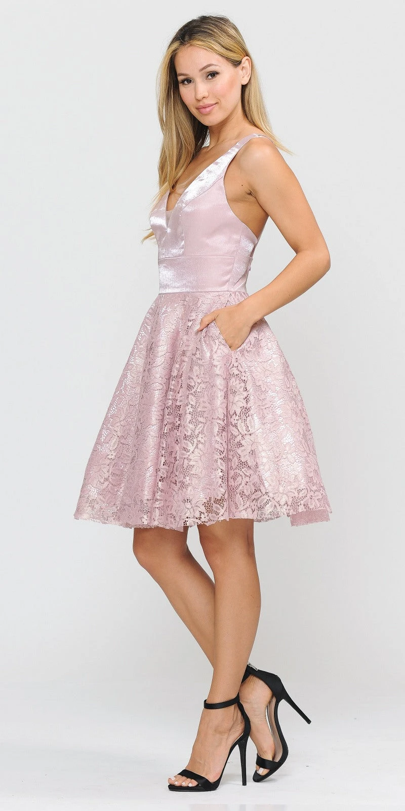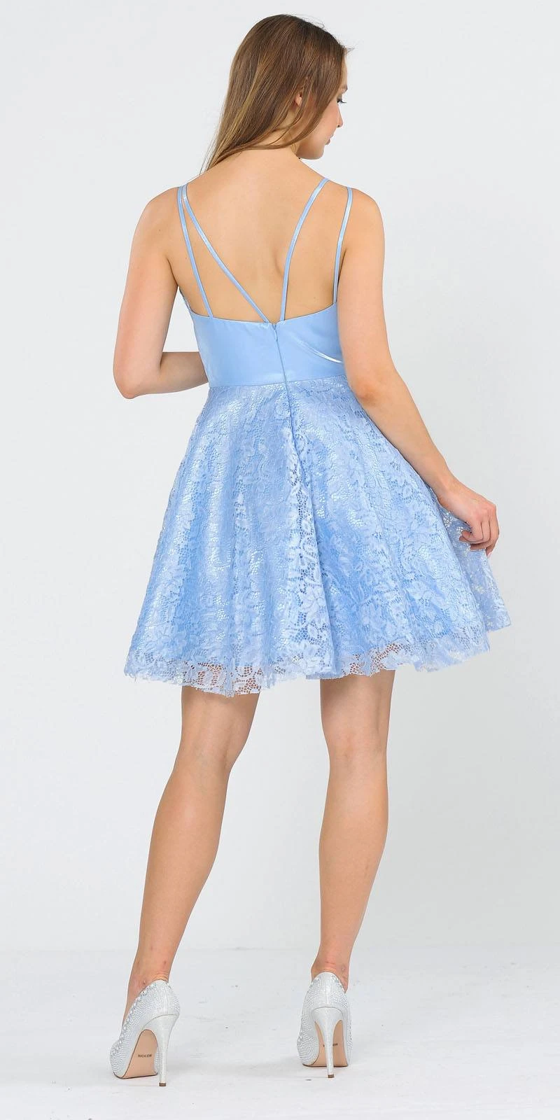 Enjoy the party with this gorgeous short dress made of sleek satin top and lace skirt. An a-line silhouette sleeveless dress with v-neck, strappy back and side pockets. This lovely dress by Poly USA | Ed Young 8418 in baby blue is a perfect dress for homecoming, cocktail and graduation parties or in any other special celebrations.