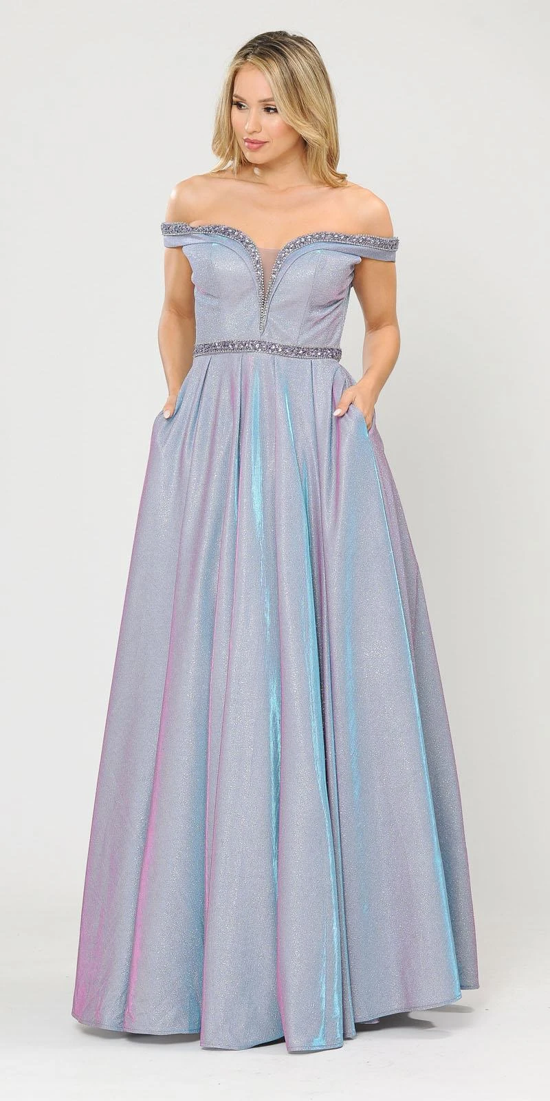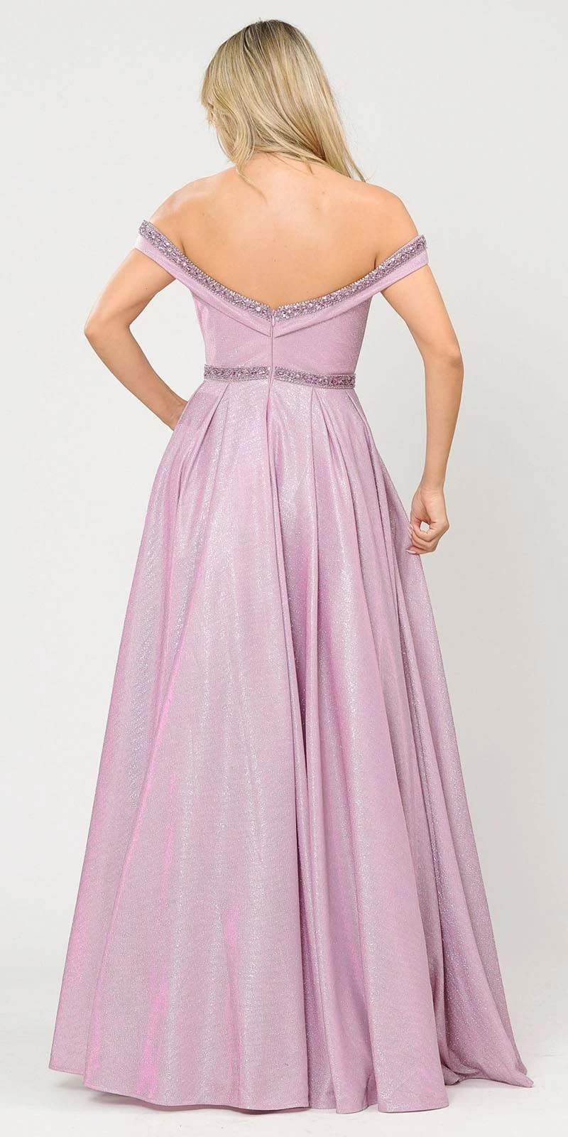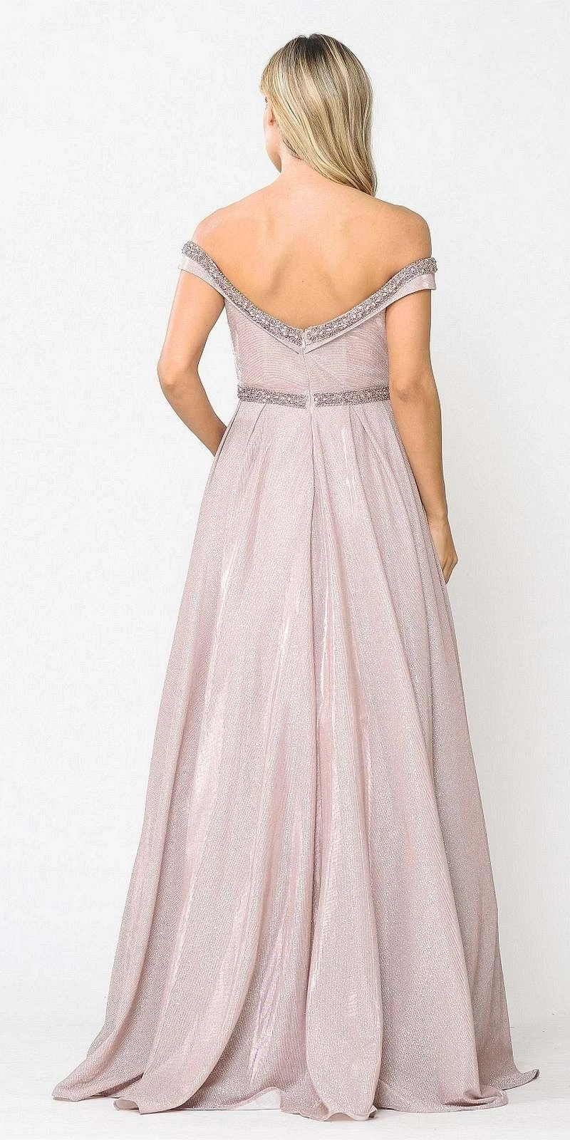 Dress up for your next special occasion wearing this fabulous evening gown made of glitter knit fabric in rose-gold. An a-line silhouette ball gown features an off-the-shoulder beautifully outlined with bead embellishments as well as the natural waist. The voluminous skirt is added with pockets for a little convenience finished with v-shape low open back with zipper closure. This fully lined dress is a perfect outfit for prom, red carpet events and gala night!