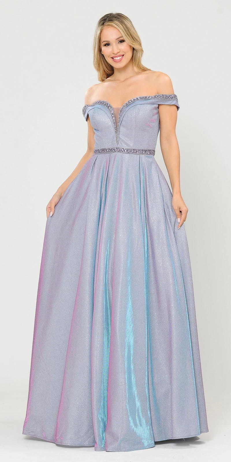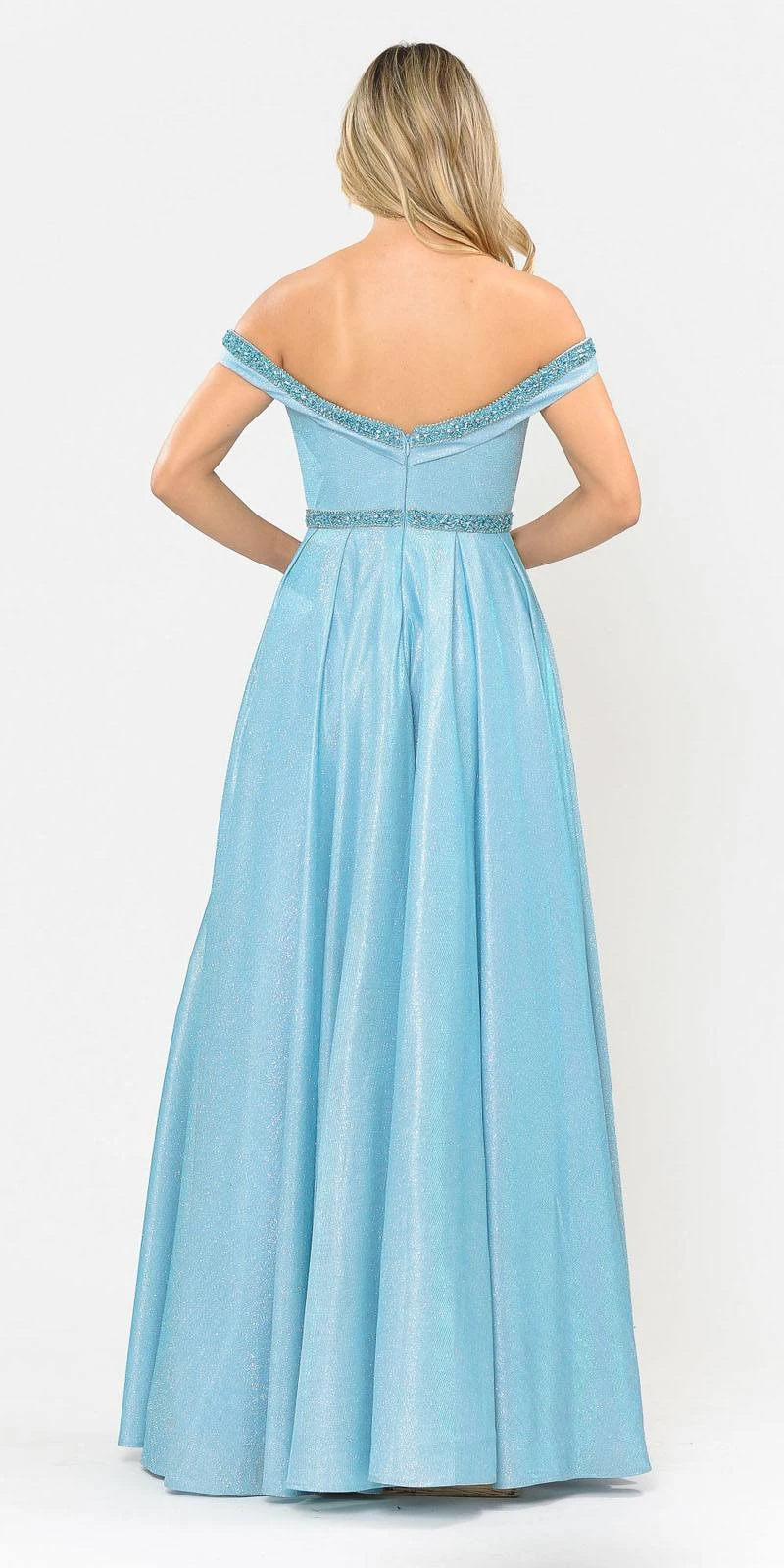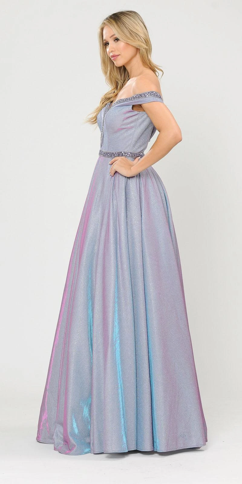 Dress up for your next special occasion wearing this fabulous evening gown made of glitter knit fabric in rose-gold. An a-line silhouette ball gown features an off-the-shoulder beautifully outlined with bead embellishments as well as the natural waist. The voluminous skirt is added with pockets for a little convenience finished with v-shape low open back with zipper closure. This fully lined dress is a perfect outfit for prom, red carpet events and gala night!