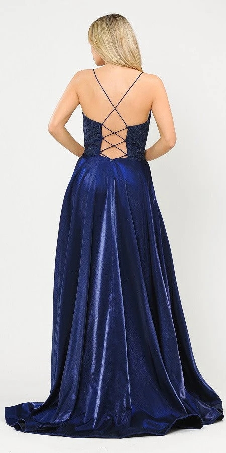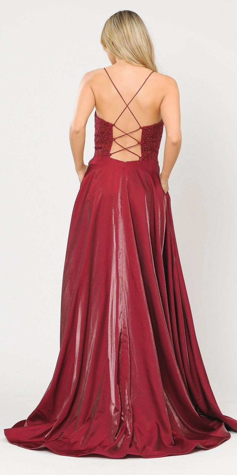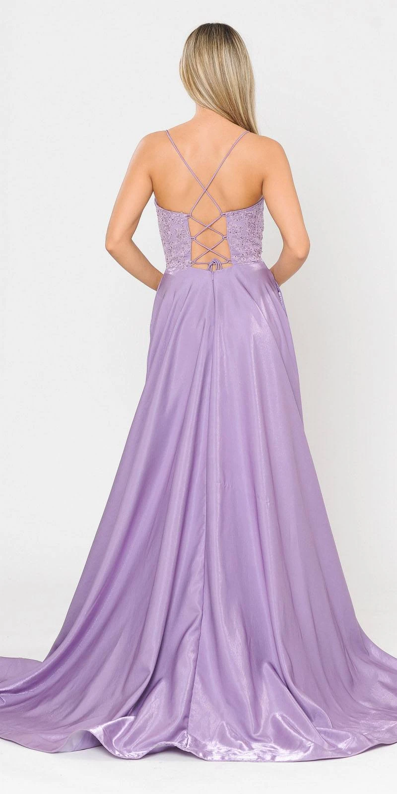 Be confidently beautiful with this lavender ball gown made of iridescent satin fabric by Poly USA | Ed Young 8670. The fitted bodice is completely covered with appliques and tiny beads, secured by a spaghetti straps cascading over the shoulder and reveal a fascinating lace-up open-back. A voluminous shimmering floor-length skirt is added with side pockets for a little comfort on your valuables. This beautiful floor length dress is absolutely fabulous for red carpet events, pageant, prom or in any other formal occasions!Â