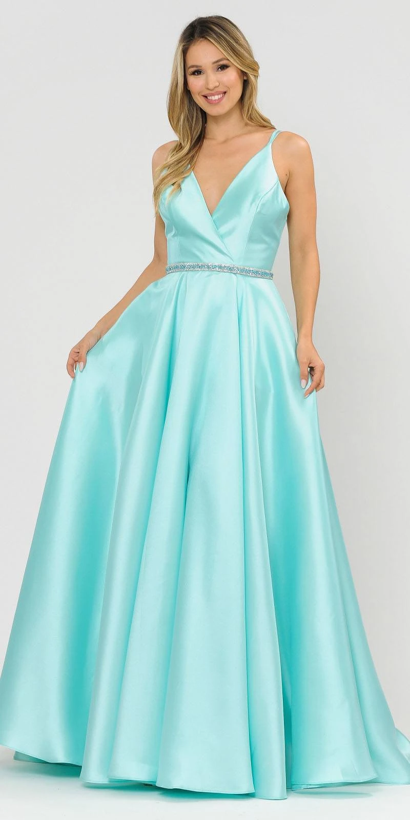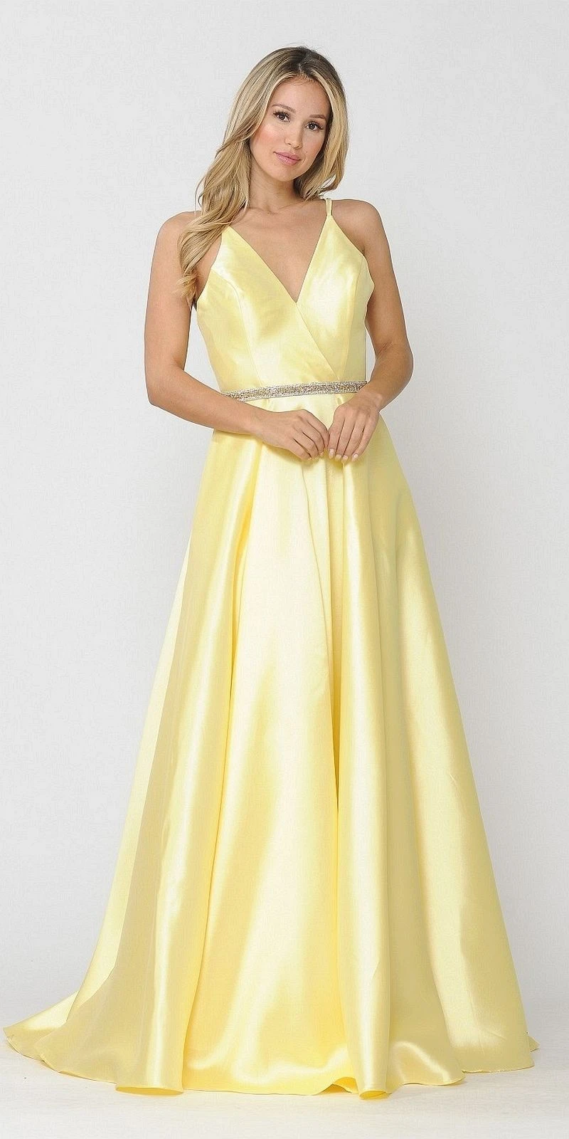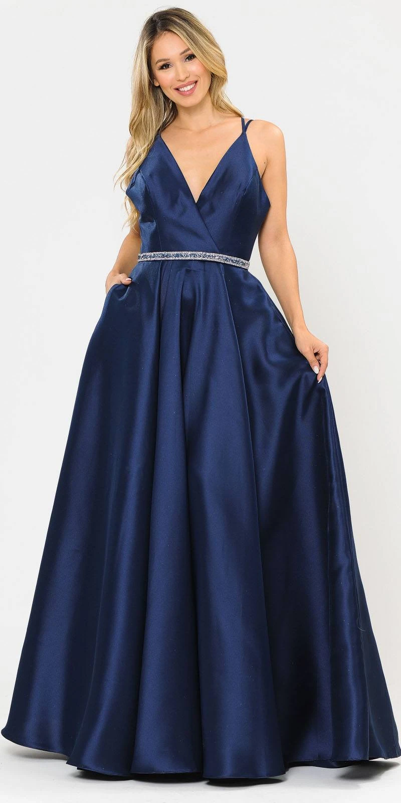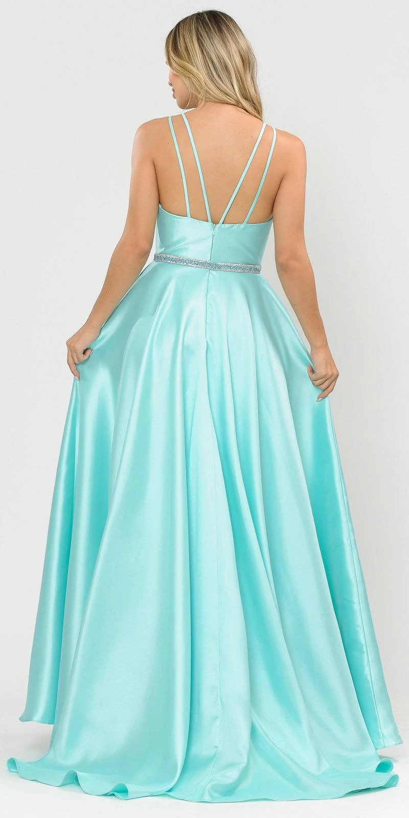 Dress up for your next special occasion wearing this a-line silhouette silk satin gown by Poly USA | Ed Young 8690 in lilac. A stunning long formal dress with v-neckline, double-straps that creates a stylish back, a dazzling band wraps around the natural waist added with pockets for a little convenience. A sophisticated ball gown perfect for prom, red carpet events, gala or awards night or in any other formal events!