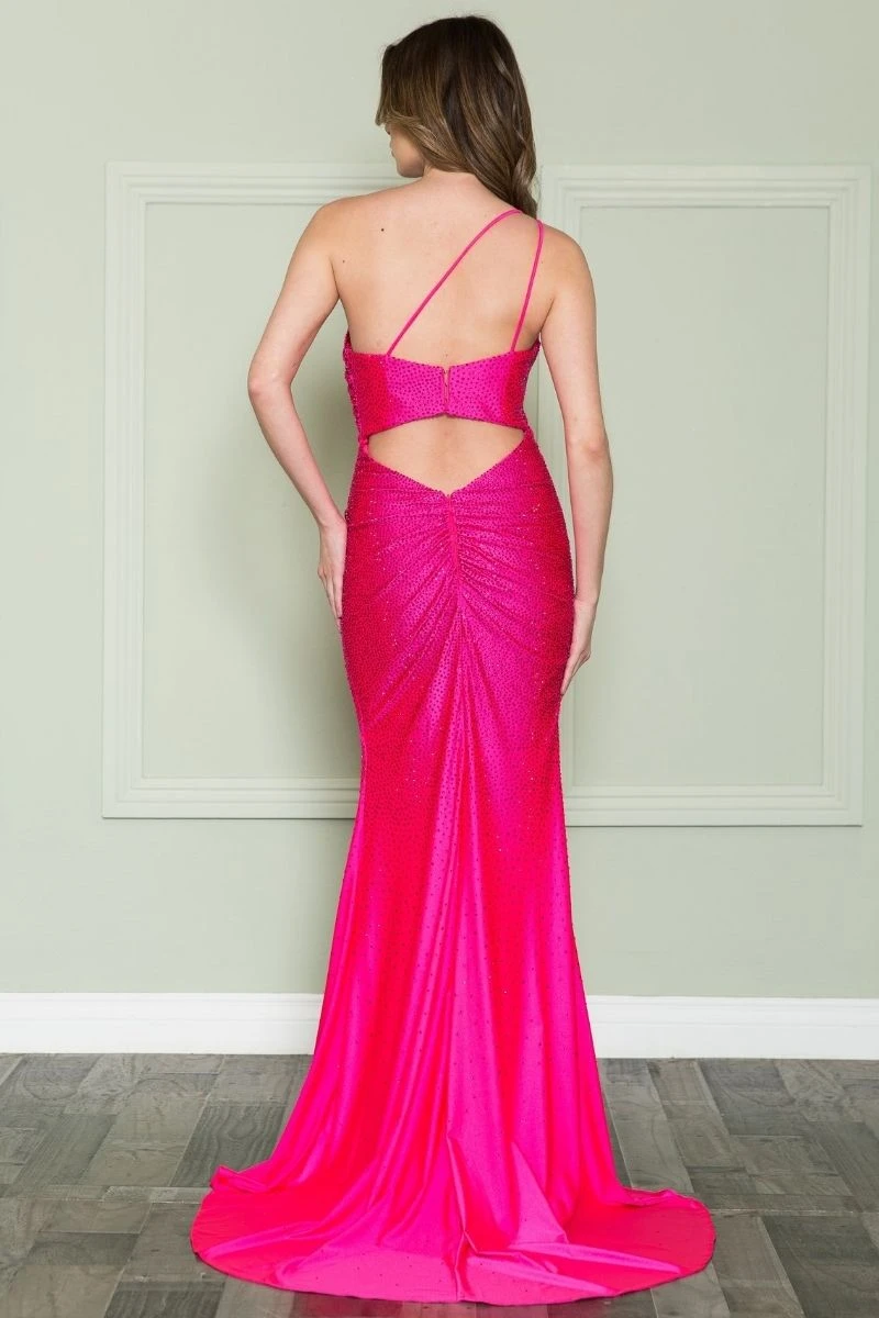 Imagine yourself wearing this beautiful floor length span jersey with rhinestones dress by Poly USA | Ed Young 8914. This long, one shoulder strap, column gown features a cut out back and open leg slit. An ideal full-length dress for red carpet events, pageant, prom or in any other formal occasions!