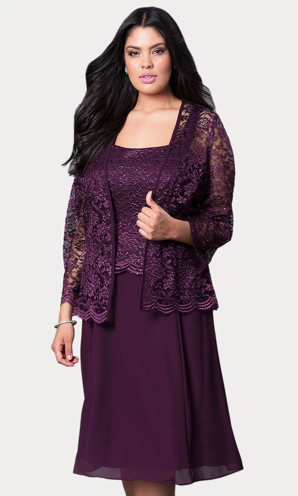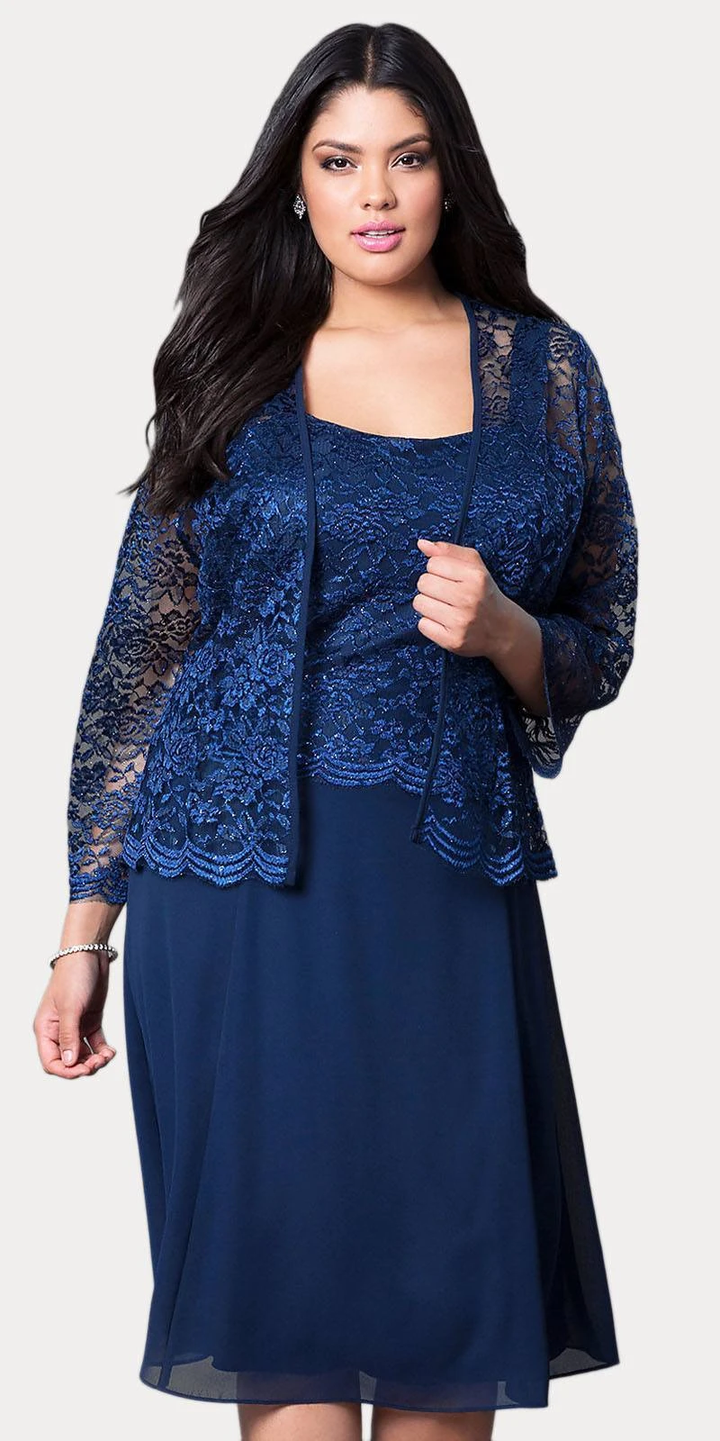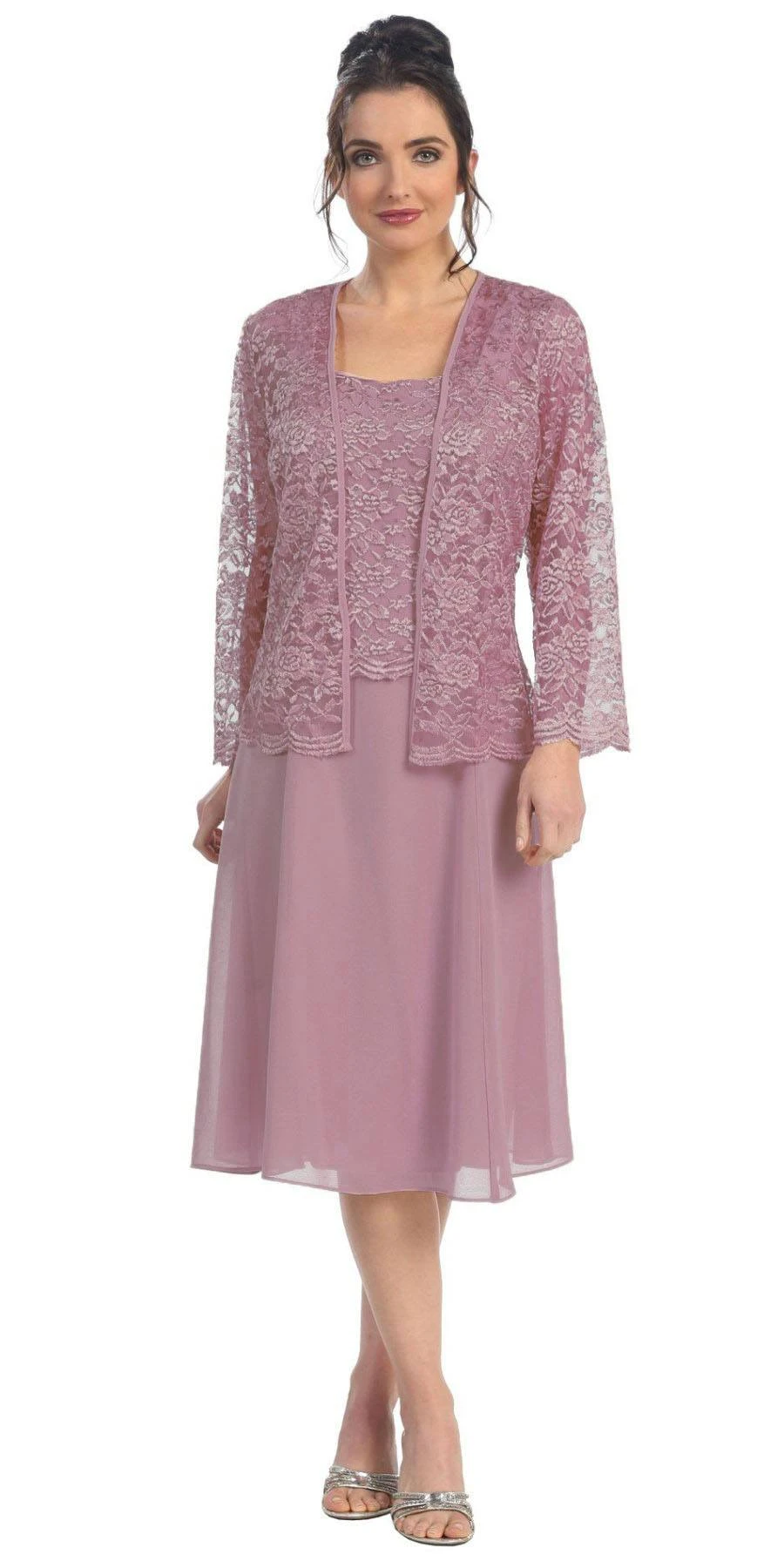 This short A line modest knee length dress is perfect for mother of the bride or another formal occasion. This lace with pebble dress has wide sleeveless tank straps and also includes a matching scalloped hemline 3/4 length sleeve lace bolero jacket, which is embellished with glitter. A classy dress for many different occasions! Click here for the longer version of this dress