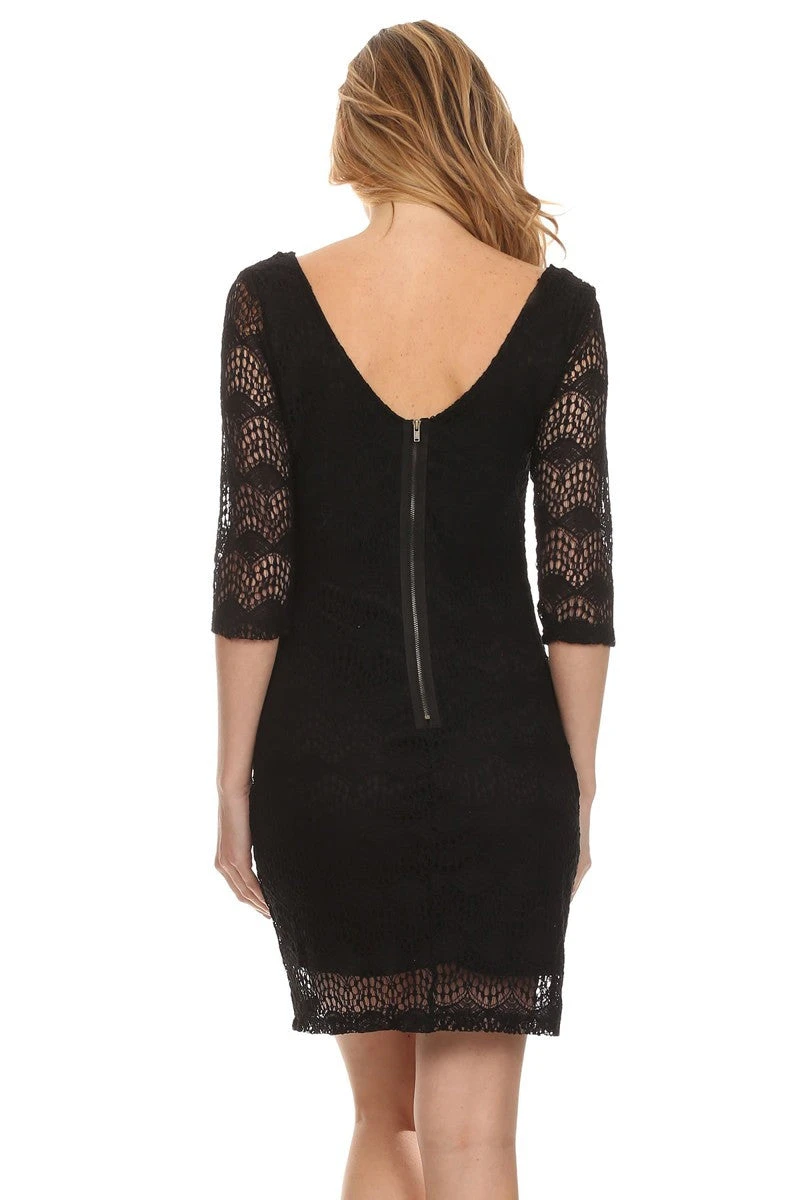 ON SALE! – Short lined crochet A-line body con dress in white with 3/4 sleeves and zipper back closure. We also carry the black version.